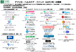 AAIC Investment Pte. Ltd.(本社:シンガポール、CEO:椿 進、以下AAIC Investment)は、当社が運営するアフリカのスタートアップ向け2号ファンド(Africa Innovation & Healthcare Fund/AHF2号)につきまして、2022年3月末にファースト・クローズしたことをお知らせいたします。 今回のファースト・クローズには、朝日インテック株式会社、エーザイ株式会社、大原薬品工業株式会社(*1)の他、大手総合商社などが参画しており、今後は投資活動を行いながら、ターゲットの150百万USドル(約185億円 *2)を目標に自己募集活動を行います。 AAIC Investmentは2017年に日本初のアフリカファンド(Africa Healthcare Fund/AHF1号)を立ち上げ、47百万USドル(約58億円)を調達し、SDGsの一つでもある、ヘルスケアセクターを中心に現在までに30社の企業へ出資・成長支援を行ってきました。AHF2号では、新型コロナウィルスの発生以降、遠隔診断、人工知能(AI)診断などDX化が急速に進んでいるヘルスケア(Healthcare)関連企業、そしてアフリカスタートアップの成長を牽引しているフィンテック(Fintech)などのテクノロジー企業を中心に出資・成長支援を行って参ります。 2021年、アフリカのスタートアップは計52.4億USドル(約6,489億円 *2)を調達(*3)し、日本のスタートアップ資金調達金額に迫る勢いですが、その中で、AAIC投資先の1社でもあるフィンテックスタートアップChipper Cashは2021年にユニコーン企業となりました。 AAIC Investmentは2015年に日系ベンチャーキャピタル(VC)/ プライベートエクイティファンド(PE)として初めて、ケニアに拠点を設立。その後、2020年12月にナイジェリア、2022年3月には南アフリカオフィスを設立、現在エジプトオフィスの設立準備に入っております。この4ヶ国は、2021年のアフリカスタートアップ投資全体の実に74%を占めています(*3)。2号ファンドでは各拠点を通じてアフリカの各地域への投資事業を行って参ります。 AAICホールディングスではファンド事業に先駆け、2012年前後よりルワンダにて自己投資事業を行う他、コンサルティング事業などを通じて現地でのナレッジを蓄積して参りました。2021年5月には最新の現地情報×ファクトフルネスを切り口に現在のアフリカを紹介した『超加速経済アフリカ: LEAPFROG(リープフロッグ)で変わる未来のビジネス地図』を上梓し、発売8か月間で6刷するなど、本書の発行を通じて日本社会のアフリカへの関心の高さに驚かされた一方で、アフリカ大陸での日本のプレゼンスは欧米や中国、インドと比べると未だ限定的と言わざるを得ません。 今後もAAIC Investmentではファンドとして投資家のリターンを極大化することはもちろん、ファンド活動を通じてアフリカでの日本ならびに日本人のプレゼンスの向上、日系企業の更なる成長を支援すべく、邁進して参ります。 代表 椿 進のコメント: 「皆さま方の多大なるご支援により、2号ファンドを設立することができました。創業時から日本を良くするために成長が必要、そのためには伸びる新興国と一緒に成長するしかないという思いでやってきました。同ファンドが日本とアフリカが共に成長する一助になると信じております」 ケニア法人代表 石田宏樹のコメント: 「私がケニアに赴任した2015年から2021年にかけて、アフリカにおけるスタートアップ投資金額は約20倍になりました。2号ファンドの運営期間である今後10年、楽しみでなりません。アフリカでは病院などのインフラが不足しているからこそ、テクノロジーが担える役割は先進国よりも大きいと考えています」 ナイジェリア法人代表 一宮暢彦のコメント: 「新型コロナを契機に『アフリカ、新興国におけるデジタルヘルスの実装』が世界の中でも大きなテーマになっています。2号ファンドではこの流れを先導しながら、世界とアフリカを繋ぎ、アフリカヘルスケア領域における新時代のリーダーとなる起業家の方々と新しい価値の創造に邁進したいと思います」 図表1投資先の国別事業展開状況 写真:AAIC Investmentメンバーご紹介 注釈 *1:五十音順、*2:2022年4月8日時点でのレートで換算(1USドル=124円)、*3:Partech調べ。 ■アフリカ2号ファンド概要 名称:Africa Innovation & Healthcare Fund(AHF2号) 投資対象国:ケニア共和国、ナイジェリア連邦共和国、南アフリカ共和国、エジプト・アラブ共和国の4カ国を中心とするアフリカ諸国など 投資対象領域:医療・ヘルスケアを中心に、金融・保険、物流など社会のインフラとなるテクノロジー企業 投資ラウンド:シード〜シリーズA・B 1案件あたりの投資金額規模: 5百万ドル〜5,000万ドル ■AAIC Investment Pte. Ltd. (AAIC Investment) 会社名: AAIC Investment Pte. Ltd. (AAIC Investment) 所在地: シンガポール 代表者: 椿 進 設立: 2013年 URL: http://aaicinvestment.com 事業内容: AAICホールディングスのファンドマネジメント会社として、2013年にシンガポールで設立。2014年から日系企業のCVC(コーポレートベンチャーキャピタル)の運営をサポート。2017年、日系初のアフリカに特化したファンド(アフリカヘルスケアファンド、AHF)を設立、アフリカの