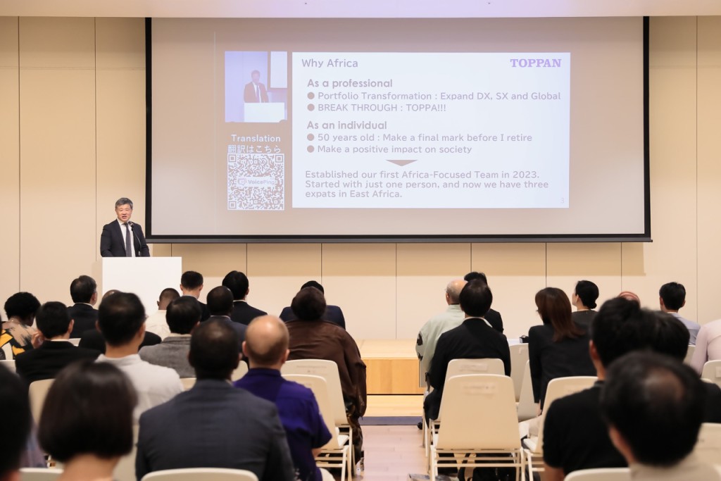 日本企業によるアフリカ進出事例紹介のパートでは、3社から事例紹介があり、飯塚修弘 氏(TOPPANデジタル株式会社、事業開発センター長 執行役員兼アフリカ事業開発室長)も登壇されました。