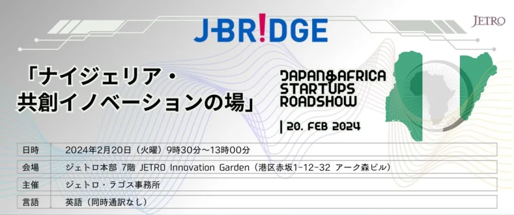 J-Bridge」の事業の1つとして、アフリカのスタートアップ・投資機関を招聘する「日本・アフリカ スタートロードショー2024」が開催されます(2/19(月)~22(木))。