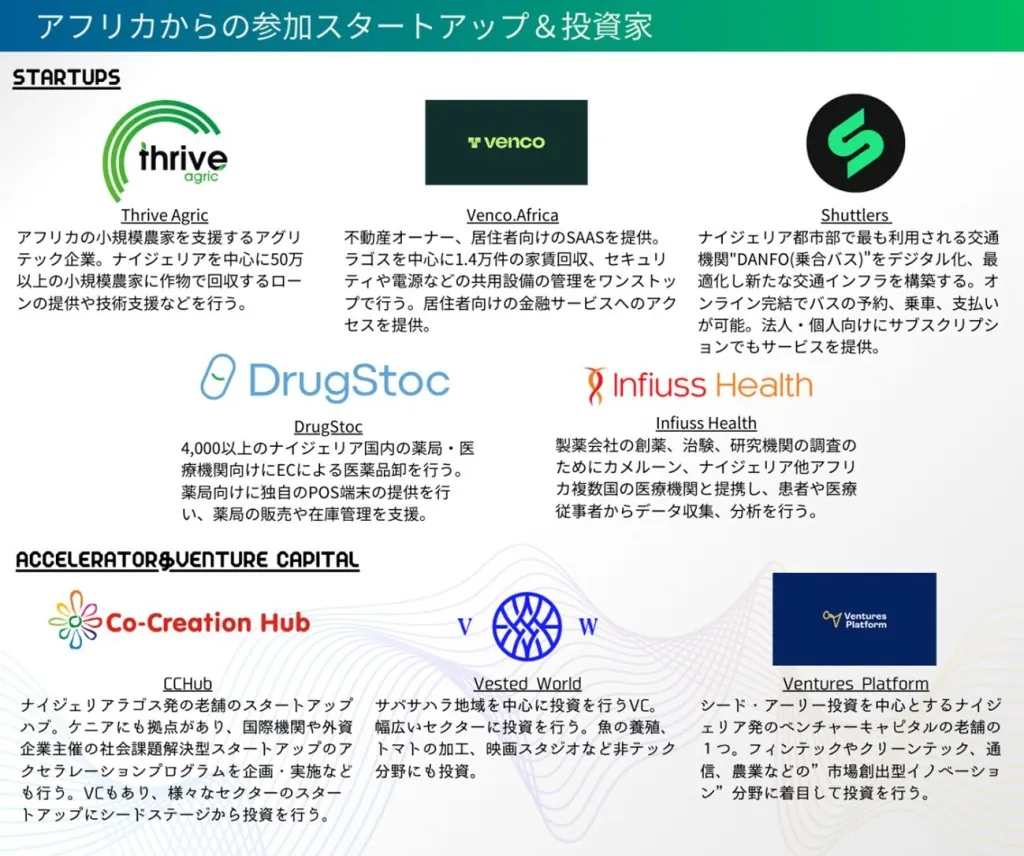 今回はナイジェリアで活動をするスタートアップ、ベンチャーキャピタル、アクセラレーターらが計8社招聘されます。