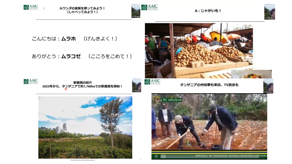 2023年10月18日、AAICコンサルタント/広報・IR担当の小郷が、日本財団デジタルトランスフォーメーション基金(通称、DX基金)に採択された一般社団法人アルバ・エデュが企画する、「子ども第三の居場所」向けオンライン授業に登壇し、アフリカの紹介を致しました。 当日は、北海道から沖縄までの13拠点、約140が参加しました。 弊社小郷からは、アフリカに接する機会の少ない子どもたちに向けて、ルワンダやタンザニアでの活動経験を基に、アフリカの魅力や現地の様子、またアフリカに関わる仕事に進んだきっかけなどを、写真や動画、クイズを交えながらお話しました。 子どもたちはルワンダやタンザニアの写真に目を見張りながら話を聞いていました。プレゼン後、司会の方からの確認クイズでは積極的に手が挙がり、国の数、現地の珍しい動物など、みんな楽しそうに答えていました。 質問タイムでも、子どもたちから多くの質問を受けました。 「ルワンダに行きたいです。持っていくのに必要なものを3つ教えてください」 「どうやって行くんですか」「どれくらい時間が掛かりますか」 「なぜ、写真に写っている人たちの肌は黒いのですか?」 「ルワンダに電車はありますか?」…など。 また授業後には、以下のようなお声も頂きました。 「子どもたちにとってアフリカは縁遠い地でしたが、授業を聞いてたくさんの興味を抱いたようです。ありがとうございました」 「素敵なお話をありがとうございました。日本だけではない広い世界があるのだということを知るきっかけになったと思います」 「卒業式での空手の型を発表されている様子がリアルでよかった」…など。 今後も、AAICは様々な形でアフリカ現地の情報発信・還元に取り組んで参りたいと思います。 【弊社小郷からのコメント】 先入観のない子どもたちの反応は率直で大変新鮮でした。教えたばかりのキニアルワンダ語(=ルワンダの母国語)のあいさつもしっかり覚えて、子どもたちの吸収力の高さに驚きました。質問タイムや後日の追加質問では興味深い疑問・質問を受け、子供たちの観点から私自身も学びを得ることができました。 これをきっかけに、将来アフリカに関わる子どもたちがでてくると嬉しいです。 一般社団法人アルバ・エデュ: ・Speak upをキーワードに、子どもたちの発話力と自己肯定力を高めることを目指して様々なプログラムを実施する団体。 ・日本財団のDX 基金に採択され、子ども第三の居場所へのオンラインによるキャリア教育の授業提供も展開。 一般社団法人アルバ・エデュ(alba edu.)|すべての子どもに話す力を! (alba-edu.org)
