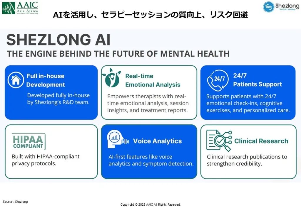 そこでShezlongはAI導入により、まずマッチングの適正化、AIによるオンラインセッションでの表情・声の解析、セッションのAIモニタリング(セラピストの不適切な発言などを回避するリスク管理とセラピストへ改善提案)を行っています。ShezlongはAIが患者との対話のソリューションではなく、あくまでもセラピストの診断の質改善、リスク管理を目的としています。