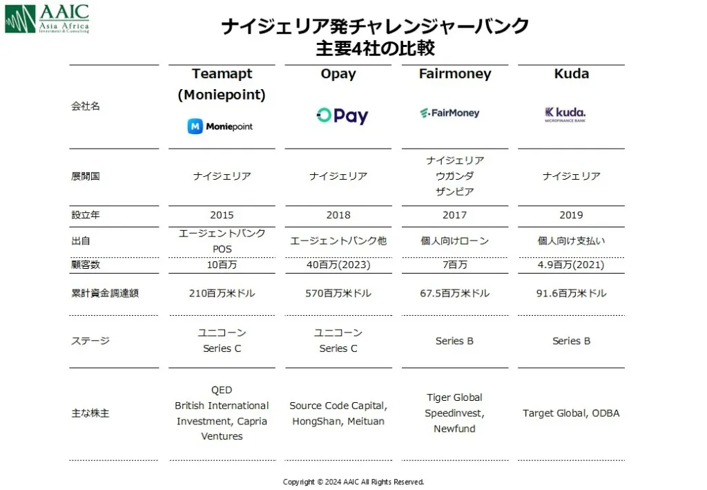 ナイジェリア発のチャレンジャーバンク市場で特に注目されるのが、Moniepoint、Opay、Fairmoney, Kudaの4社です。それぞれ異なる「出自」を持ちながら、成長の過程で独自の強みを発揮し、現在の市場地位を築いてきました。