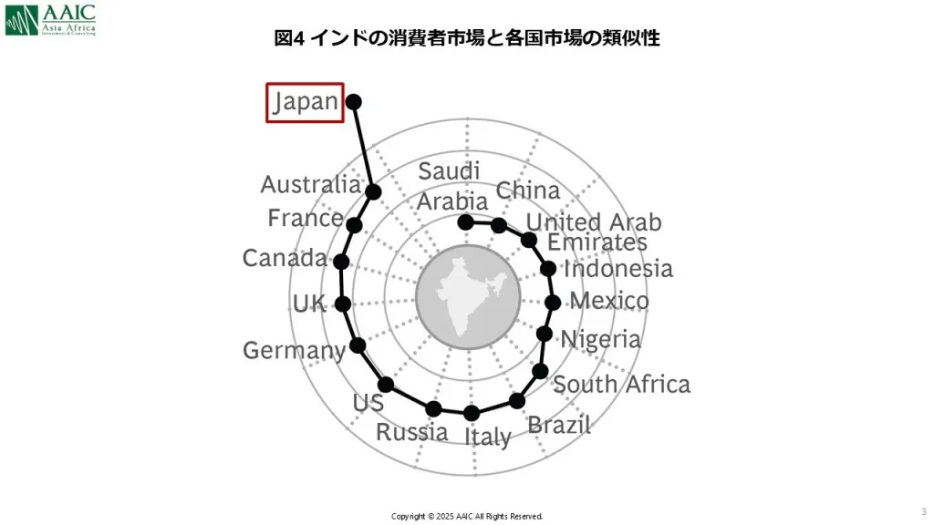それでは、このようなインド人たちとどのようにして日本企業は向き合っていくべきなのでしょうか? これまでの私の経験上、優秀なインド人、中でも海外経験のある若いインド人は、欧米流/最新の経営・事業スタイルをベースにコミュニケーションを取るビジネスパーソンが多く、特にインド人だからと言って身構えることはないように思います。 また、日本にも一定の理解があり、トヨタやソニーなどの日系グローバル企業のお陰で、ハードウェアやコンテンツ分野に対するリスペクトをもって接してくれる方も多いと感じています。おそらく日本人が「難しい」と感じるのはインド財閥企業や昔ながらの国内インド企業とのビジネスの場であることが多いかと思います。 一方で、インド市場を理解することは日本人にとって容易でないことはその通りかと思います。2021年にBCGが分析した各国消費者市場の類似性を分析したレポート*6を見ると、これは衝撃ですが、インドと日本のマーケットが主要国の中でも最も離れた位置づけであることが分かります(図4)。さらに、いくつかのテーマについて各国消費者の考え方の類似性/相違性を分析した結果を見てみても、「個人vs.コミュニティー」、「将来に対する考え方」、「起業家精神」のどれをとっても、日本とインドはほぼ対極に位置します(図5)。これらの結果を見ると、日本の消費者市場に慣れ親しんだビジネスパーソンであればあるほど、インドの消費者市場を理解することが難しいと言えるかもしれません。また、同様にインド従業員と一緒に組織を作り上げていくことも一朝一夕では進まないことを暗に意味しているとも言えます。