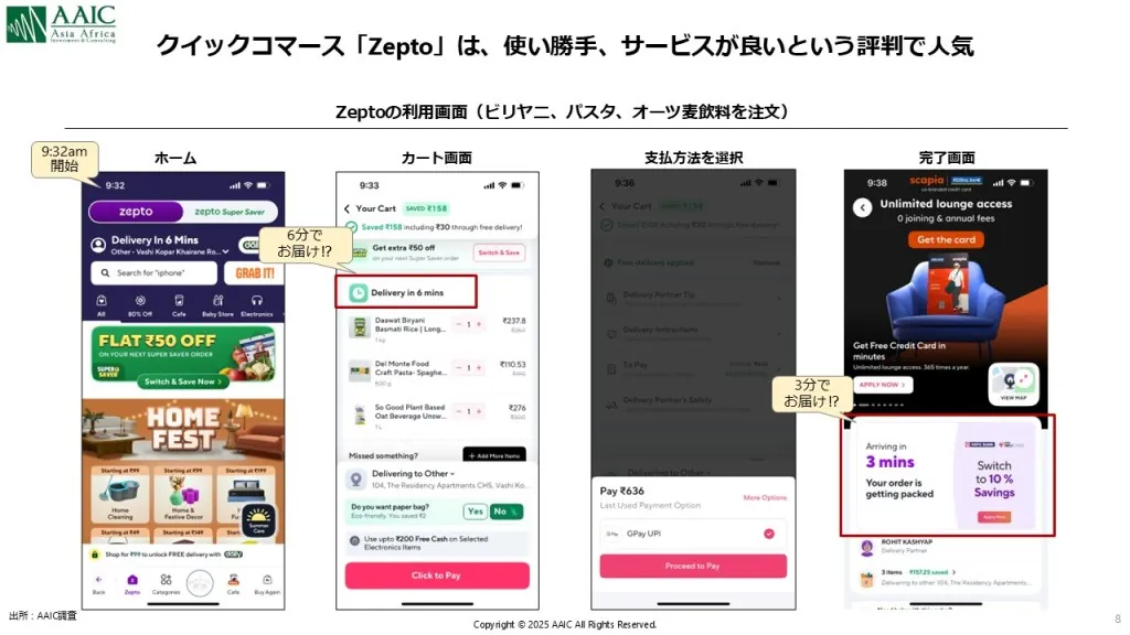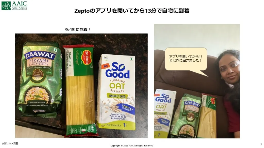 インドではEC利用が急速に普及しつつありますが、同時にクイックコマースも猛スピードで立ち上がりを見せています。GOV(Gross Order Value)ベースで2022年の約450億インドルピーから、わずか3年で2025年には6,400億インドルピーへと拡大する見通しです(CareEdge Research調べ)。 クイックコマースは、オンライン上に掲載された商品を注文するという点ではECと変わりがありませんが、注文後、わずか20分程度で荷物が届くという点が大きな特徴です。ムンバイ近郊に住む弊社のスタッフがZeptoを使って注文した時の様子ですが、9:32にアプリを開き注文を開始、その後9:45には自宅への配送が完了しています。とにかく早いのです(図7)。 この仕組みを支えているのが、市内各所に設けられた「ダークストア」と呼ばれる小型倉庫/店舗群で、そこからバイク便の配達員がラストワンマイル配送を担うことで、極めて短いリードタイムを実現しています。コロナ禍におけるフードデリバリーの普及や、配達員の人件費の安さ、元々の配達文化が根付いていたことなどの複合要因で、他国での成功事例の少ないクイックコマースがインドではしっかり定着しつつあります。このため、食品に限らず化粧品等の消費財ビジネスをする場合、今や都市部では欠かすことが出来ない販売チャネルの1つとなっています。【図7 インドのクイックコマースの利用例】