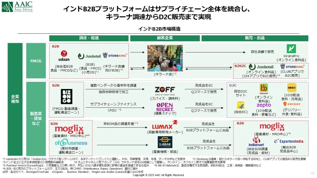デジタル化の波はB2C領域にとどまらず、B2B領域でも進んでいます。MSME(中小企業)のデジタル化・オンライン調達が進み、製造・卸・小売をつなぐ新たな商流が生まれています。Redseerの推計(2023年時点)によると、GMV(流通総額)ベースの市場規模は、2024年時点で約 USD 24Bnなのが、2030年までにUSD95 Bnまで成長すると予測されています(図8)。 インドでも、これまで先進国や他の新興国で見られたように、業界ごとにB2Bプラットフォームが登場しています。代表的な例として、伝統小売と卸をつなぐUdaan(FMCG・アパレル・農業資材分野に展開)、建設・建材向けにマーケットプレイスと自社OEM製造を組み合わせるInfra.Market、製造業の間接資材に特化したMoglix、そして原材料販売と与信機能を統合したOfBusinessなどがあり、様々な業界でB2Bプラットフォームが生まれています(図9)。 各社に共通するのは、単なる取引プラットフォームにとどまらず、デジタル化によって多層流通構造の非効率を解消すると共に、在庫・物流の可視化を実現している点です。さらに、サプライチェーン全体を支援する在庫管理・物流機能や、ファイナンス機能を通じた商取引の流動性向上にも取り組んでおり、エコシステム全体の効率化と成長を後押ししています。 現地にいても、一見するとMSMEや伝統小売は従来型のビジネスを続けているだけのように見えますが、実際には業界ごとに登場するスタートアップが、裏側でデジタル化とビジネスモデルの更新を進めています。こうした変化は、現地企業と取引を行う際にも見逃せない重要な観点であり、日本企業もその変化に併せたアップデートを進めて行く必要があります。【図8 B2Bマーケットプレイスの市場規模】