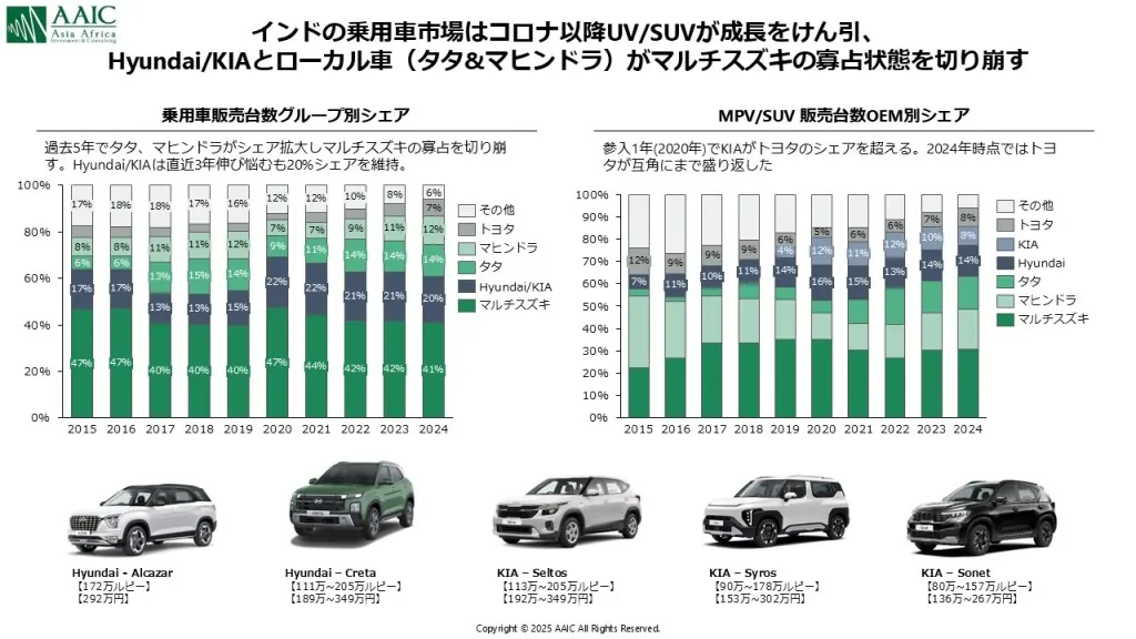 インドの自動車市場は、新車販売台数が急速に伸び、2023年に販売台数が400万台を超えるなど、急成長中の大市場です。インドの自動車市場といえば、これまでは手ごろで品質の良いマルチスズキがシェアの半数近くを持つ代表企業でした。マルチスズキは現地マス層のニーズを正しく捉え、AltやSwiftといった低価格な小型車で市場を席巻しました。 一方、近年のインドでは中間層が急速に増加、新たな製品を求める消費者が増えていますが、そこに目を付けたのがKIAでした。KIA(起亜自動車)は、ヒュンダイ(現代自動車)のグループ企業の韓国自動車メーカーで、2019年にインドに本格的に市場参入しました。後発参入ですが、両者合計で市場シェアの20%前後を保持しています(図2)。なぜそのような急成長を遂げることが出来たかというと、KIAは市場参入前に徹底的な分析を行い、インド現地企業の成長、中国車の参入開始といった複合的な状況を突破するためには、「プレミアム戦略に勝算あり」と判断し、そのうえで、「Aspirational(憧れの)」なブランドとしてのポジショニングを選択して、SUV(Sport Utility Vehicle)に特化して市場参入したためです。「手の届く憧れ」という立ち位置を確立するため、「たくさん売ること以上に、ブランドイメージの構築に力を注いだ」(Tae Jin Park、2代目社長)ことで、後発組ながらもシェア獲得に成功しました。 とはいえ、インドでコスパは非常に重要な要素のため、参入当初から現地に工場を建設し、企画から製造、販売まで一気通貫で実現しました。KIAは「Make in India for the World」という戦略的なコンセプトの下、インドを「世界の製造ハブ」として70か国を対象にインドから輸出をしています。現地で大量生産することで、高品質なプレミアムカーを手の届く価格で販売可能としました。【図2 KIAの新車販売シェアと市場投入製品の例】