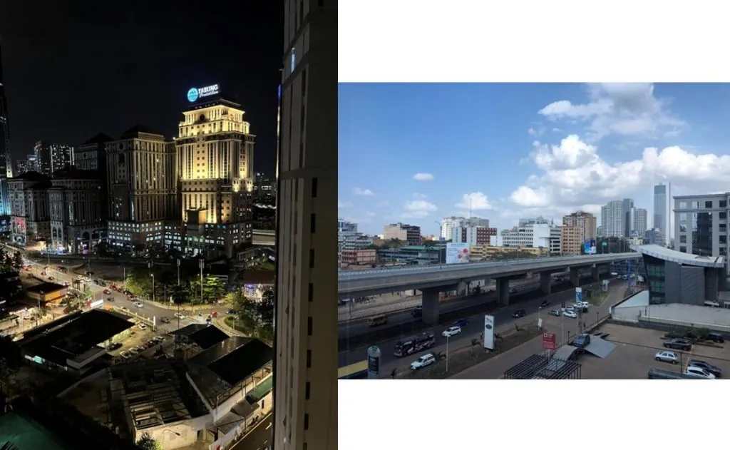 【写真1:(左)クアラルンプール中心部(2024年12月)/(右)ナイロビ中心部の街並み(筆者撮影)】