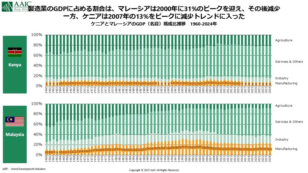 なお、マレーシアの製造業比率は伸び続けているわけではなく、2000年に30.8%まで上昇し、そこから徐々にサービス経済へ移行。一方、ケニアは 12.7%(2007年)をピークに縮小に入っている。