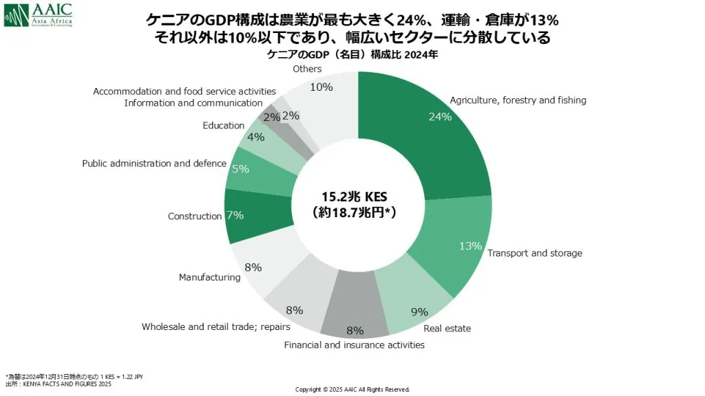 では、製造業の比率が13%で頭打ちになったケニアは、今後成長を見込めないのだろうか。もちろん、そんな単純な話ではない。ケニアのポテンシャルに期待している読者も多いと想像する。 まずは現在のGDP構成比をおさらいしよう。2024年のケニアGDP構成比(KNBS)は以下の通り。