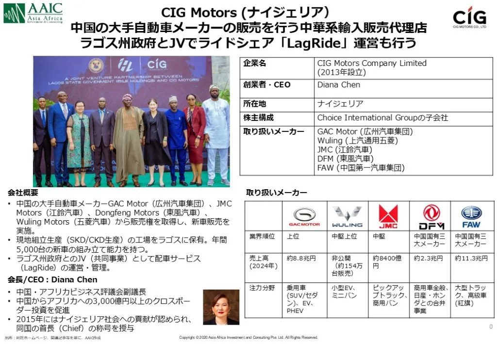 CIG Motors Company Limitedは、ナイジェリアにおける中国自動車メーカーの正規代理店として事業を展開し、GAC Motor(広州汽車集団)、JMC Motors(江鈴汽車)、Dongfeng Motors(東風汽車)、Wuling Motors(五菱汽車)など複数ブランドを取り扱っています。