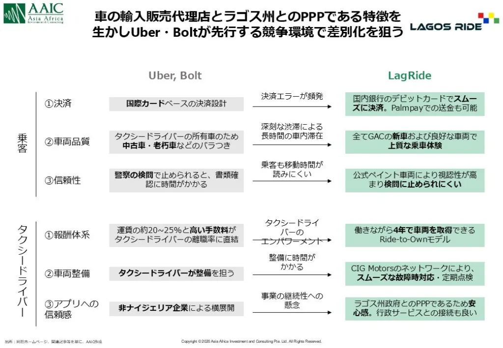 ① 最大の差別化:頭金ゼロの“Ride-to-Own”モデル Lagrideの象徴的な特徴が、働きながら4年で車両を取得できる Ride-to-Own モデル。 頭金ゼロ、フリート提供者(CIG Motors)が車両供給、稼いだ運賃から返済、最終的に車を所有できる、Uber/Boltでは「車がない人」は参入自体が難しいですが、Lagrideはこれまで参入できなかったギグワーカー的労働者に市場を開いた形です。ただこちらは、Uberでも以前の記事でお伝えした通り、Mooveというスタートアップを使うことでUberのドライバーはRide to Ownが可能となります。 ② メンテナンス・サポートが迅速 ― 車両サプライチェーンを自社で保有 CIG Motors が整備ネットワーク・パーツ供給網を持っているため、故障時対応、車両の定期点検、稼働率向上がスムーズです。Uber/Boltでは個人が整備を担うため、ダウンタイムが長くなりがちです。 ③ 政府との公式連携による安心感(PPPのメリット) Lagrideがラゴス州政府とのPPPであることは、ドライバーにとっての心理的ハードルが非常に低いのも特徴です。路上での検問時のトラブルが減る、行政サービスとの制度接続が強い、事業の継続性への信頼感が高い。