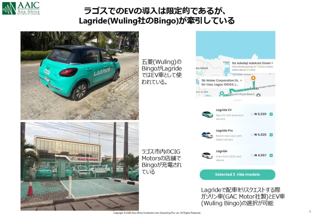 中国の主要な車メーカーは、すでにアフリカ数カ国でEVを展開しており、ナイジェリアでも段階的に導入を始めています。ただしEV市場は、単に車両を投入すれば拡大するほど単純ではありません。急速充電器などのインフラ整備、補助金や規制といった政策面の後押しが不可欠であり、国家のエネルギー政策と密接に結びつく領域です。 ナイジェリアのEV普及は、他のアフリカ諸国とは異なる複雑さを抱えています。人口2.4億人という巨大市場は多国籍メーカーにとって非常に魅力的である一方で、電力の約8割が天然ガス火力という産油国特有の構造を持ち、政策としてEVの導入を積極的に推し進めにくいというジレンマがあります。政府としては、ガソリン車からEVへの急速な転換は必ずしも自然な方向性ではなく、慎重にならざるを得ません。 このような環境下で、車の代理店であるCIG Motors の立場から考えると、フリートとして運行を管理でき、走行データやバッテリー性能などの実証データを蓄積できるライドシェア事業は、EV導入の最初の一歩として非常に合理的な選択肢です。さらに Lagride はラゴス州政府とのPPP事業であるため、行政と協力しながらインフラの設置場所や政策課題の検証が可能です。 つまり、LagrideはCIG Motorsにとって複雑なジレンマを抱えるナイジェリアのEV導入の“実験場”として最適な条件を備えた希少なプラットフォームと言えます。