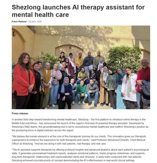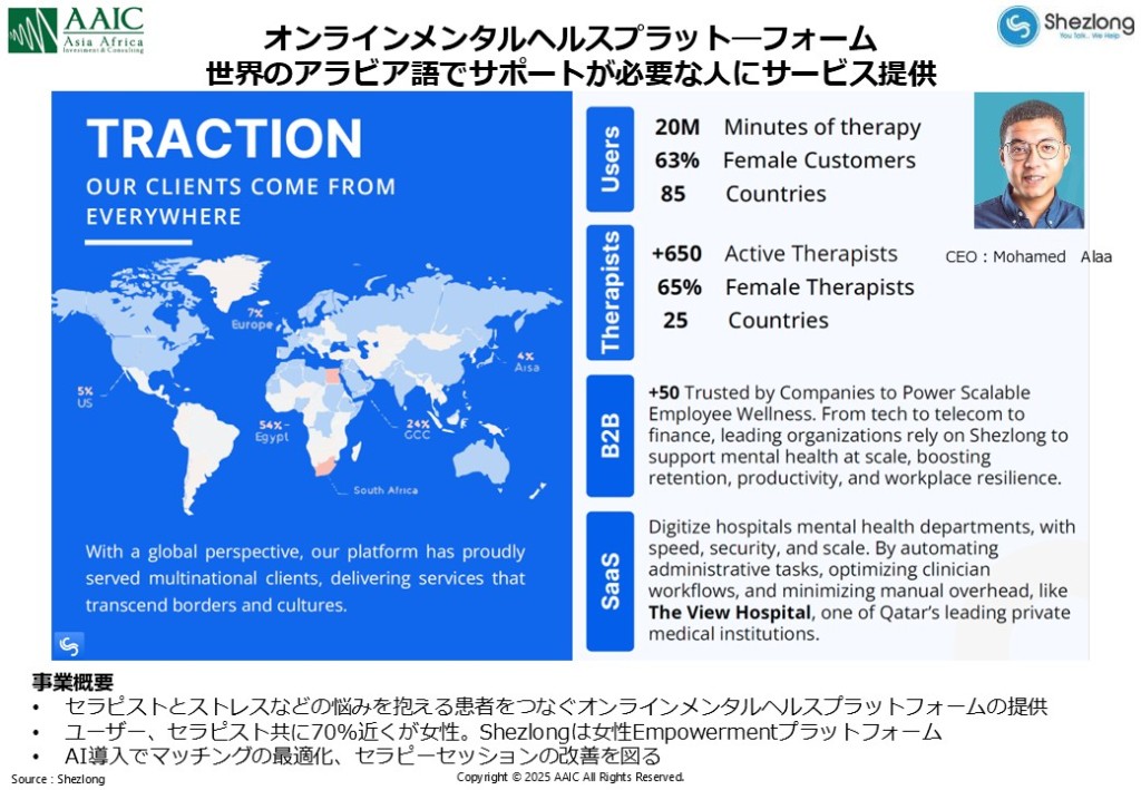 また、Rologyは米国のMIT(マサチューセッツ工科大学)、兵庫県立大学など、大学と連携し、AIを活用した画像解析の進化を図っています。Rologyが匿名化された放射線データセットを提供(Rologyは4億以上の画像を保持。今回はその中から特定の専門分野のデータを共有)し、兵庫県立大学は研究インフラと学術的専門性を提供する戦略的な提携を行っています。日本ではヘルスケア関連データへのアクセスが課題となることもあり、相互補完する提携は非常に有意義なものです。Shezlong:エジプトのオンラインメンタルヘルス