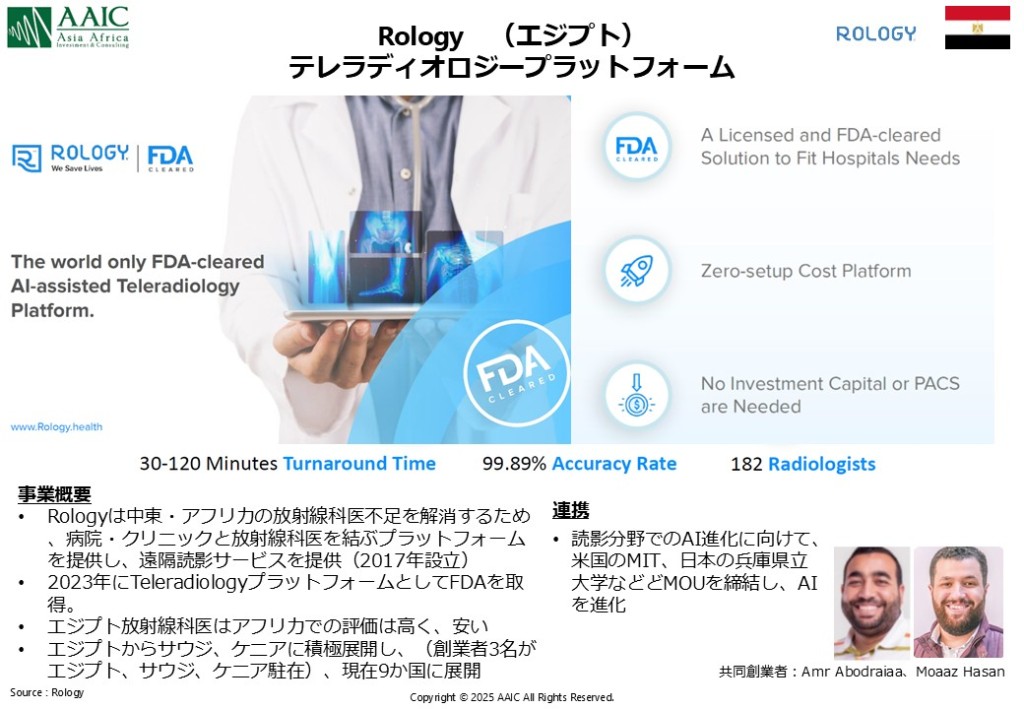 アフリカでは医師の不足が深刻で、放射線科医もアフリカの多くの国で1万人当たり0.01~0.03人と先進国や日本の約0.5と比較し、不足は顕著です。Rologyはエジプト発のスタートアップで、放射線科医不足という深刻な課題解決に向けて、遠隔読影プラットフォームを立ち上げました。