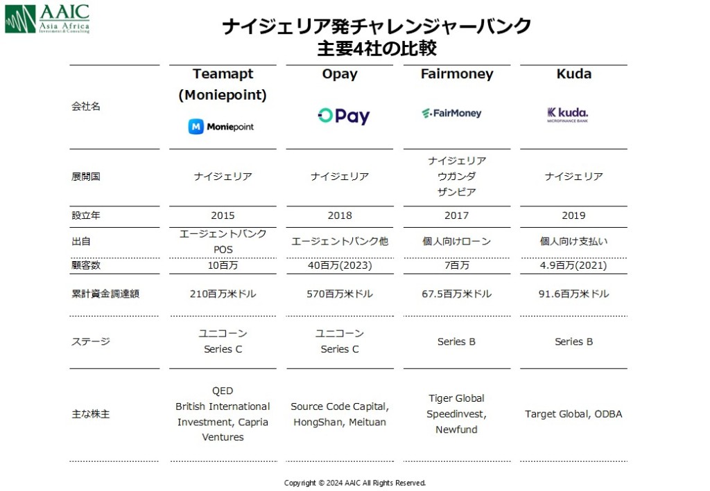 ナイジェリア発のチャレンジャーバンク市場で特に注目されるのが、Moniepoint、Opay、Fairmoney, Kudaの4社です。それぞれ異なる「出自」を持ちながら、成長の過程で独自の強みを発揮し、現在の市場地位を築いてきました。