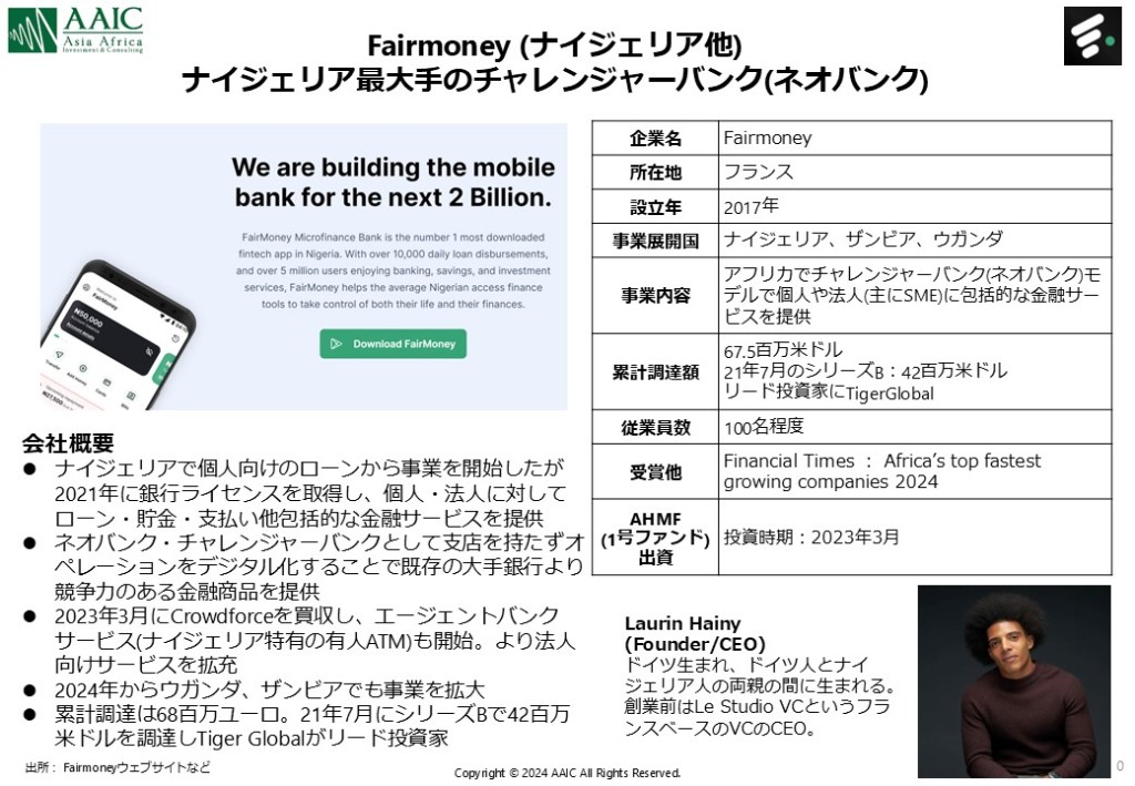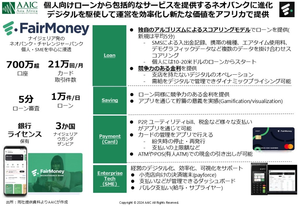 Kudaは「ナイジェリア版Nubank」を標榜するデジタルバンクとして誕生しました。当初は手数料ゼロの口座運営や、個人向けのシンプルなバンキング体験に注力し、特に若年層をターゲットに急成長しました。その後、銀行ライセンスを取得し、ローンやデジタル決済の提供を拡充。現在では、ナイジェリアのミレニアル世代やジェネレーションZの間で強い人気を誇る消費者向けサービスを中心に展開しています。FairMoney (AAICファンド出資先): ローン提供から包括的な銀行サービスへ