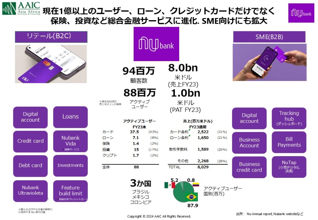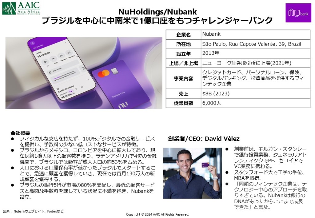 「チャレンジャーバンク」とは、主にデジタル技術を活用して従来の商業銀行が提供できないニーズに応える新興の金融機関を指します。その多くが物理的な支店を持たず、オンラインベースで運営される点が特徴です。 「ネオバンク」という言葉もよく混同されて使われますが、これは独自で金融機関のライセンスを持たずに、既存の商業銀行と提携して運営されていることが多いです。既存の商業銀行が持たないある特定の機能に特化してネオバンクとして事業を開始し、事業規模が拡大し資金調達をしたタイミングで単独で銀行ライセンスを取得し、その後、より包括的な金融サービスを提供するチャレンジャーバンクへ進化するケースがあるため、2つの言葉が混同されているという背景があります。 チャレンジャーバンクで実際に口座を開設し使ってみると、従来の商業銀行と同様に、送金、ローン、カード発行など包括的なサービスを提供しており、一見明確な違いを見つけるのが難しいですが、総合格闘技のファイターがもともと空手、ムエタイ、ボクシングなど様々な「出自」があるように、チャレンジャーバンクの各社にも銀行ライセンスを取得し商業銀行としての総合格闘技のリングに上がるまで、ネオバンク時代にどのような事業で成長をしてきたのか「出自」を追うことで各社の個性を理解することができます。 「デジタルを駆使している(た)か?」という点で、議論が分かれることになりますが、日本においてもセブン銀行は”チャレンジャーバンク”という言葉が生まれる前から、その性質を持っていたと言えるかと思います。日本全国を網羅するセブンイレブンの店舗網を用いて、「どこでも、いつでもお金をおろせる」という独自のビジネスモデルから発展し、口座保有者を増やして従来の大手商業銀行が待ち受ける総合格闘技のリングへと上がっていきました。新興国チャレンジャーバンクの成功モデル:Nubank