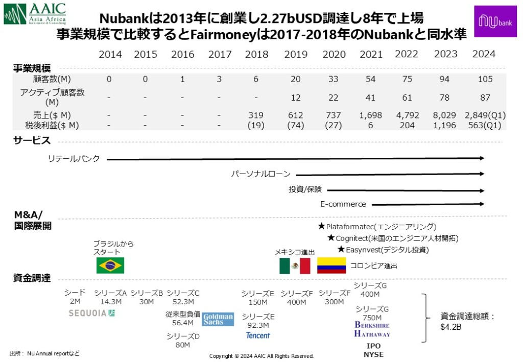 アフリカを含む新興国でも多くのチャレンジャーバンクが生まれていますが、1番の代表例はブラジル発のNubankです。大手銀行が揃ってサービス改善をしない寡占かつ硬直的な市場に目をつけて、個人向けのオンラインをベースでの支払いやローン、カード発行など効率の良い、高い顧客体験の新しい銀行サービスを提供することで急成長を遂げました。2014年にサービスをローンチし、10年でユーザーは1億人を超えます。 またこの爆発的な成長を見てSequia, Goldman Sachs, Tencent, Berkshire Hathwayと名だたる投資機関が出資を行い、創業から8年の2021にNYSEに上場しました。 アフリカを含む多くの新興国フィンテック・チャレンジャーバンクがNubankのケースを参考にしています。