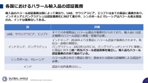 各国は輸入製品に対して異なる規制を設けており、ハラール認証の義務化や表示義務の有無、検査体制に差異があります。
