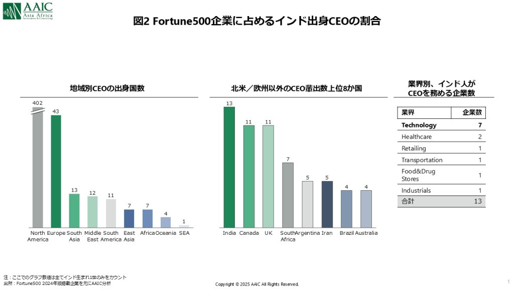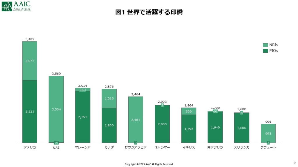 日本人にとって、世界で活躍する中国人(華僑)は身近な存在かと思いますが、同様に世界中でたくさんの「印僑」が活躍しています。印僑という言葉の定義は曖昧な部分がありますが、一般的に「19世紀以降のインドからの海外移民」を指します。さらに、インド政府の定義では、印僑は下記の2つのタイプに分類されています。 ・NRI(Non-Resident Indians):インド国籍を持つ、インド人非居住者 ・PIO(People of Indian Origin):インド以外の国籍を保有するインド系の在外居住者 インド政府が発表している2024年11月時点の世界の印僑に関する統計データを見ると、世界の印僑はおよそ3,500万人程度で、インド人口14億人に対し2.5%程度のインパクトということになります。 印僑の多い国Top10を見ると、アメリカが1位で約540万人、次いで中東、東南アジア、アフリカ地域の印僑が多いことが分かります(図1)*2。NRI/PIO別でみると、中東諸国の多くは短期の出稼ぎ労働者であることが推察される一方、マレーシア、ミャンマー、南アフリカなどではPIOが多く、多くの印僑が現地に定住していることが伺えます。また、印僑数トップのアメリカについてはNRI、PIO共に一定数が存在しています。では、どのような印僑がアメリカで活躍しているのでしょうか?