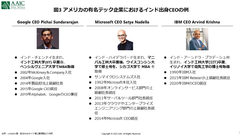 冒頭で述べたような優秀なインド人の獲得競争が世界中で始まっていますが、インド人は本当に優秀なのでしょうか? いくつかの観点から分析してみたいと思います。 まずは、アメリカのFortune 500(2024年)の企業に占める各国のCEO比率を見てみたいと思います(図2、AAIC調べ)。北米出身者が402名、欧州出身者が43名と圧倒的に多く、それに次いで多いのがインドの13名となります(インド系2世の3人を含めると、16人となります)。東アジアは台湾3名、中国と韓国がそれぞれ2名、日本は0名なので、相対的にインド比率の高さが目立ちます。また、インド出身者がCEOを務める企業を業界別で分析すると約半数の7名がテクノロジー系であり、インド人がIT系産業において活躍していることが分かります。 例えば、Google/Alphabet CEOのPichai Sundararajan氏、Microsoft CEOのSatya Nadella氏、IBM CEOのArvind Krishna氏など、アメリカを代表する企業のCEOが皆インド出身です(図3)。さらに、近年の欧米企業の経営者まで範囲を広げるとスターバックス前CEOのLaxman Narasimhan氏、シャネルCEOのLeena Nair氏、MasterCard 前CEO/世界銀行総裁のAjay Banga氏など枚挙にいとまがありません。 さらに日本でも2022年に亀田製菓が日本本社のトップにジュネジャ・レカ・ラジュ氏を登用したことがニュースとなりましたが、世界的に見ると不思議な話ではないことが分かります。