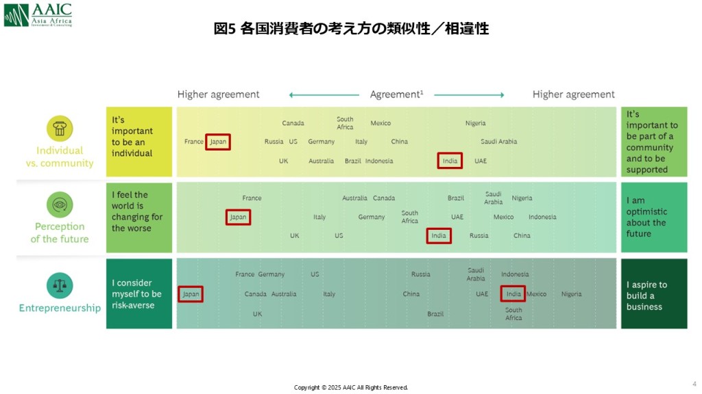 それでは、このようなインド人たちとどのようにして日本企業は向き合っていくべきなのでしょうか? これまでの私の経験上、優秀なインド人、中でも海外経験のある若いインド人は、欧米流/最新の経営・事業スタイルをベースにコミュニケーションを取るビジネスパーソンが多く、特にインド人だからと言って身構えることはないように思います。 また、日本にも一定の理解があり、トヨタやソニーなどの日系グローバル企業のお陰で、ハードウェアやコンテンツ分野に対するリスペクトをもって接してくれる方も多いと感じています。おそらく日本人が「難しい」と感じるのはインド財閥企業や昔ながらの国内インド企業とのビジネスの場であることが多いかと思います。 一方で、インド市場を理解することは日本人にとって容易でないことはその通りかと思います。2021年にBCGが分析した各国消費者市場の類似性を分析したレポート*6を見ると、これは衝撃ですが、インドと日本のマーケットが主要国の中でも最も離れた位置づけであることが分かります(図4)。さらに、いくつかのテーマについて各国消費者の考え方の類似性/相違性を分析した結果を見てみても、「個人vs.コミュニティー」、「将来に対する考え方」、「起業家精神」のどれをとっても、日本とインドはほぼ対極に位置します(図5)。これらの結果を見ると、日本の消費者市場に慣れ親しんだビジネスパーソンであればあるほど、インドの消費者市場を理解することが難しいと言えるかもしれません。また、同様にインド従業員と一緒に組織を作り上げていくことも一朝一夕では進まないことを暗に意味しているとも言えます。