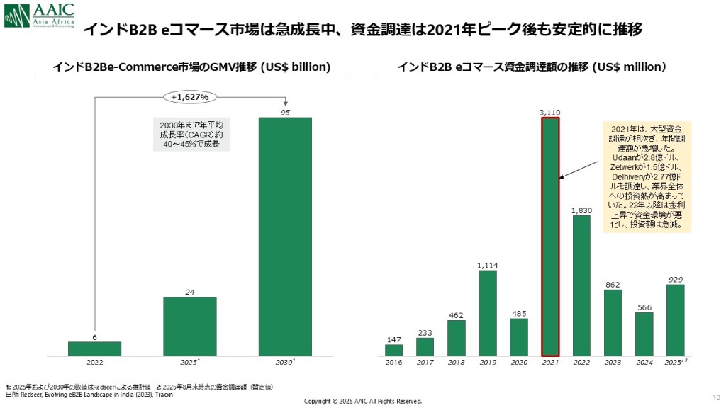 デジタル化の波はB2C領域にとどまらず、B2B領域でも進んでいます。MSME(中小企業)のデジタル化・オンライン調達が進み、製造・卸・小売をつなぐ新たな商流が生まれています。Redseerの推計(2023年時点)によると、GMV(流通総額)ベースの市場規模は、2024年時点で約 USD 24Bnなのが、2030年までにUSD95 Bnまで成長すると予測されています(図8)。 インドでも、これまで先進国や他の新興国で見られたように、業界ごとにB2Bプラットフォームが登場しています。代表的な例として、伝統小売と卸をつなぐUdaan(FMCG・アパレル・農業資材分野に展開)、建設・建材向けにマーケットプレイスと自社OEM製造を組み合わせるInfra.Market、製造業の間接資材に特化したMoglix、そして原材料販売と与信機能を統合したOfBusinessなどがあり、様々な業界でB2Bプラットフォームが生まれています(図9)。 各社に共通するのは、単なる取引プラットフォームにとどまらず、デジタル化によって多層流通構造の非効率を解消すると共に、在庫・物流の可視化を実現している点です。さらに、サプライチェーン全体を支援する在庫管理・物流機能や、ファイナンス機能を通じた商取引の流動性向上にも取り組んでおり、エコシステム全体の効率化と成長を後押ししています。 現地にいても、一見するとMSMEや伝統小売は従来型のビジネスを続けているだけのように見えますが、実際には業界ごとに登場するスタートアップが、裏側でデジタル化とビジネスモデルの更新を進めています。こうした変化は、現地企業と取引を行う際にも見逃せない重要な観点であり、日本企業もその変化に併せたアップデートを進めて行く必要があります。【図8 B2Bマーケットプレイスの市場規模】