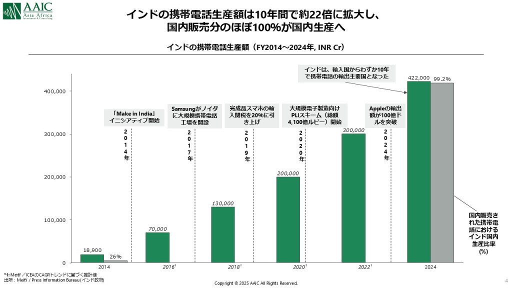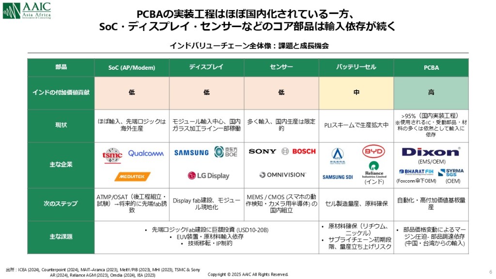 インドの製造のハブ化は他の産業でも広がっています。インドの携帯電話生産額は10年間で約22倍に拡大し、現在は国内販売分のほぼ100%が国内生産となりつつあります(図3)。さらに、Appleの中国からインドへの工場移転を契機に、Foxconnインド工場から米国への輸出が拡大し、急速にインドの輸出ハブ化が加速しました(図4)。また、「インド版Foxconn」とも呼ばれるDixonも中国スマホメーカーの受託生産により大きくシェアを拡大しています。 その結果、例えばPCBA(Printed Circuit Board Assembly)の実装工程の95%以上はインド国内で行われていたり、バッテリーセルについてもインド政府によるPLI Scheme(生産連動型インセンティブ)により、国内生産化が後押しされていたりします。一方で、バリューチェーンの主要な部品については未だ輸入に依存しており、付加価値ベースでの現地化率はまだ限定的と言えます。SoC・ディスプレイ・センサーなどのコア部品の国内生産化が次なる成長ドライバーとして期待されています(図5)。【図3 インドにおける携帯電話生産額の推移】