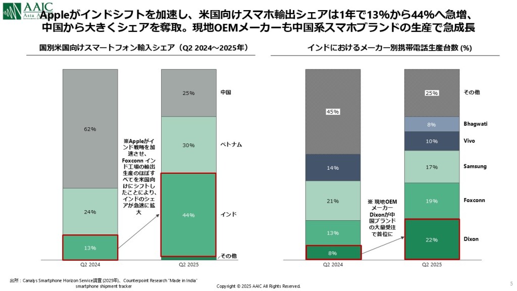 【図4 米国スマートフォン輸入国シェアおよびインドにおけるメーカー別携帯電話生産台数の推移】