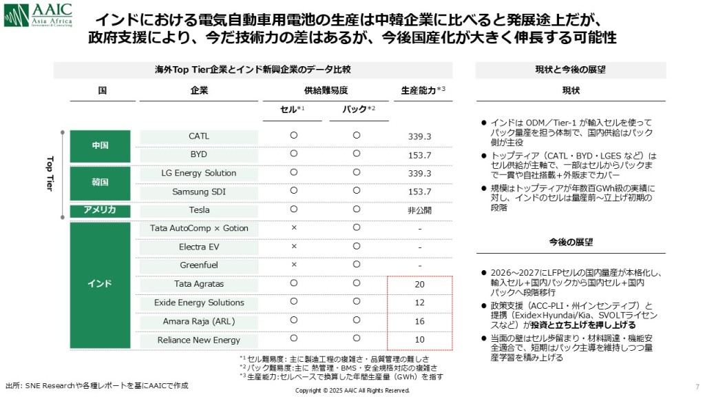 昨年まで続いた政府支援(FAME IIなど)により、インド国内のEV市場は急速な立ち上がりを見せましたが、現在もなお車体コストの低下や充電インフラの整備、またデリバリーサービス事業者によるEV二輪の全面採用などを背景に、EV市場は成長を続けています。こうした流れを受け、前述した携帯電話用バッテリーに加えて、EV用バッテリーの国産化に向けた準備も急ピッチで進んでいます。 現状としては、インドは輸入セルを使って国内でバッテリーパックを組み立てる体制となっており、国内供給の主役はパックメーカーとなっていますが、2026〜2027年にLFP(リン酸鉄リチウム)セルの国内量産の本格化を計画中で、「輸入セル+国内パック」から、「国内セル+国内パック」へ段階的に移行し、バッテリー分野における高付加価値製造拠点としての発展が期待されています(図6)。【図6 各国EVバッテリー企業の比較とインドの現状と今後の展望】