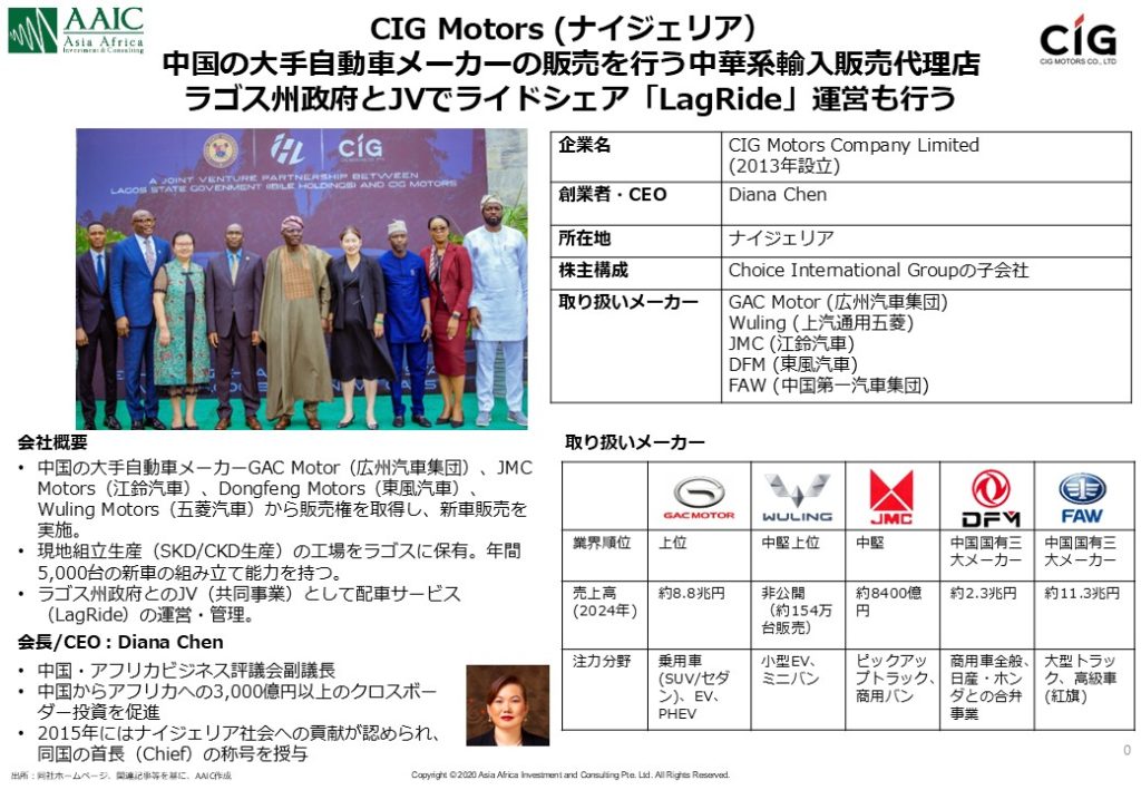 CIG Motors Company Limitedは、ナイジェリアにおける中国自動車メーカーの正規代理店として事業を展開し、GAC Motor(広州汽車集団)、JMC Motors(江鈴汽車)、Dongfeng Motors(東風汽車)、Wuling Motors(五菱汽車)など複数ブランドを取り扱っています。