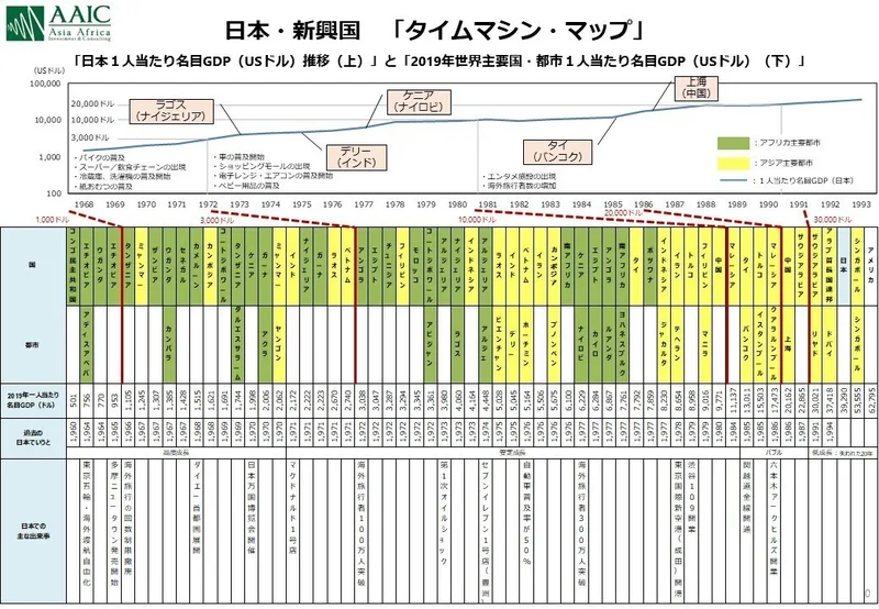 次のポイントは、「3000ドル」ラインです。日本では1972年頃です。このラインは外食元年でもあります。日本でマクドナルド1号店ができたのが、1971年の銀座。すかいらーくの1号店も1970年です。 ケニアのナイロビが、2014年ごろに3000ドルを超えました。その頃、ケンタッキーフライドチキン、ドミノピザ、コールドストーンが進出してきました。ちょっと遅れて、バーガーキングができました。 3000ドルを超えると、大型ショッピングモールも出てきます。当時、私は子供で横浜に住んでいましたが、日本最大のダイエー戸塚店がこの頃にオープンしたのをよく覚えています。 巨大なアドバルーンと店内のダイエーの歌は鮮烈な思い出です。1000ドルまでは中古車やバイクですが、3000ドルを超えると新車(乗用車)が売れ始めます。カラーテレビ、クーラーなども売れ始めるタイミングです。当時「3C」といわれていました。 アフリカで3000ドルラインにあるのが、ナイジェリアのラゴス、国でいえばエジプトやモロッコです。 次のポイントが「1万ドル」です。日本でいうと1980年あたり。消費文化が爛熟・多様化してきます。日本では東急ハンズ渋谷店(78年)ができ、渋谷の109(79年)ができ、東京ディスニーランド(83年)ができた。1万ドルを超えると、こういうものにお金を使えるようになるのです。 スーパーやデパートで買い物するだけではなく、ちょっと変わったものが欲しい、カッコイイものがほしい、となって新しい文化が生まれるのです。それが「1万ドル」ラインです。 1万ドルでは、海外旅行も一気に広がります。ちょうど今(2020年)、中国が国全体で1万ドルに届こうとしていますが、海外旅行がさらにブームになっていくでしょう。 日本では、海外旅行者が1986年に500万人を突破、1990年に1000万人を突破と、たった4年間で2倍に伸びました。スキー場などのリゾートでのレジャーが本格化するのも1万ドルライン。 中国の都市部ではもう2万ドル以上になっているので海外旅行ブームがすでにきていますが、これから全土で1万ドルを突破して、全土レベルでブームが広がるでしょう。それを考えると今後、インバウンドは新型コロナ前のレベルでは済まない。 とんでもない数の中国人が日本に来るでしょう。人口は13億人。いままでの5~10倍、日本に来てもおかしくない。 「新型コロナってなんだったんだ」と言われるようになるには4〜5年かかると思いますが、日本のインバウンドは大きな可能性がまだたくさんあると思います。 アフリカで1万ドルのレベルに達しているのは、南アフリカの首都・ヨハネスブルグと、豊かな石油資源を持つボツワナ、リビアです。 日本人は、これからアフリカで起きることを知っている 時代換算マップを作っていて、改めて感じたのは、あらゆる世界の国が、国で3000ドル、都市で1万ドルはほぼ到達できるのではないか、ということです。戦争・内戦をせず、政治がある程度しっかりしていれば。それだけ、人類に叡智がついていると思います。 もともと、近代工業化は欧米にしかできないと言われていた時代もあったのです。100年前の植民地時代はそのように考えられていたようです。ところが、日本が欧米以外で初めて近代工業化に成功しました。 そして戦後しばらくして、NIESと呼ばれていた台湾や韓国が近代工業化を成し遂げ、次に中国、さらには東南アジア、インドも近代工業化を実現させていった。非欧米諸国だから経済発展できないなどということは、ありえなくなったのです。人種や歴史や国民性は関係がなかった。 あらゆる国が一定レベルまでの経済発展が可能だと思います。世銀だったり、IMFだったり、コンサルタントだったりがそのためのノウハウを持っている。そして多くの人たちに「豊かになりたい」という根源的なモチベーションがある。 日本のように2次産業の輸出から立ち上がったり、資源で引っ張ったり、成長パターンはさまざまで、時間軸も国によってまちまちかもしれません。でも、国で3000ドル、都市で1万ドルまでは行ける。伸びていく。 そして一足先に3000ドル、1万ドル、2万ドルをこの50年で体験してきた日本人は、実は、どのタイミングで何が起きるかを、よく分かっているはずなのです。 ファッション雑誌を出すのであれば、どのタイミングなのか。1万ドルなら、どんなものが必要とされるのか。そうした経験やノウハウを、もっと活かすべきです。同じようなことがこれから起こる国々がたくさんあるのですから。 中国でも、東南アジアでも、インドでも、ほとんど同じタイミングで、同じことが起こっています。これはアフリカにも必ず起きるはずです。もっと復習をして、アフリカでビジネスを推し進めていくべきなのです。答えはわかっているはずなのですから。 振り返れば、私が生まれた頃は、日本はまだ一人当たりGDPが1000ドルの国でした。そのあたりから高度成長を経て、奇跡と言われる凄まじい成長を遂げていった。円も強くなった。