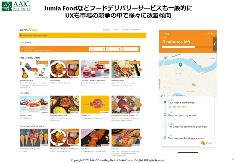 これらのグローバルなファストフードだけでなく、ローカルの老舗レストランのメニューも家で楽しむ、フードデリバリービジネスも徐々にですが一般的になっています。アフリカのAmazonと呼ばれるJumiaはJumia Foodというフードデリバリービジネスを展開しており、ラゴスでは200を超えるレストランのメニューの注文がスマートフォンで可能です。Jumia Food以外にもライドシェアサービスを世界展開しているエストニア発のスタートアップBoltがBolt Foodをローンチしたり、ナイジェリアの複数のローカルスタートアップが始めたりと多くのプレーヤーが出てきています。 私自身もJumia Foodは3年ほど前に初めてナイジェリアに来た時からよく利用しています。当時は、注文してから1-2時間かかるのは当たり前ですし、デリバリーを行うドライバーから場所がわからないなど注文を受け取るまでに5-6回電話のやりとりが必要でストレスのかかるものでした。それでも市内のレストランに行くと移動で渋滞、注文してから30分以上待たされることもあるので、それであれば居心地の良い家で仕事や好きなことを過ごして1-2時間でも待とうともサービスを根気強く使っていました。しかし、新型コロナもあり、フードデリバリービジネスが注目されるなかで少しずつカスタマーエクスペリエンスも改善している感覚があります。まだすべての注文に適用されていませんが、ドライバーの位置情報をGPSでリアルタイムに表示したり、できるだけ電話を少なくしてテキストメッセージでドライバーとやりとりができるようになったりしています。今後も複数の競合企業の間で健全な競争が進めば、我々ユーザー側にとってより快適なサービスになると期待しています。