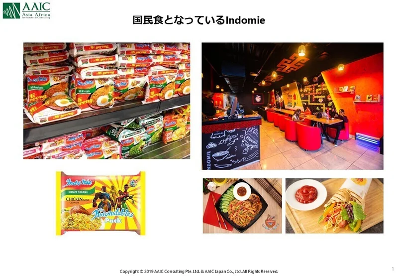 インドネシアの巨大コングロマリット企業のSalim(サリム)グループの即席めんブランドであるIndomie(インドミ―)はナイジェリアで国民食と言っていいほど人々の生活を支えるものになっています。ナイジェリアでは1980年後半頃からシンガポール系のTolaram (トララム)Groupがナイジェリアへの輸入を始め、徐々に人気商品となり、1995年には現地で工場も設立されました。現在ナイジェリアの即席めん市場は年間25億食近くと言われており、世界でも11番目に大きな市場と言われています。国内には10以上の即席めんブランドがありますが、Indomieは圧倒的な支持を受けています。1パック(1食)10-15円ほどで販売されており、年齢、所得層、宗教などに関わらず幅広い層に人気があります。 今一緒に働いているナイジェリア人の同僚(30代女性)はイギリスで昨年第一子の出産をしたのですが、段ボール数箱にindomieを詰めてナイジェリアから持っていったという話を聞き驚きました。小さい頃からよく食べており、今でも週に2-3回は必ず食べるということでした。スープと一緒か焼きそばのように汁なしかなど、レシピも多く存在し、各家ごとに独自のIndomieの食べ方があるようで、人々の生活に深く結びついていると言えます。 家庭料理として人気のIndomieですが、ラゴス市内には現在3店舗ほど「Indomie café」というファストフードレストランもあり、様々な調理方法でindomieを提供するフラッグシップストアとなっています。