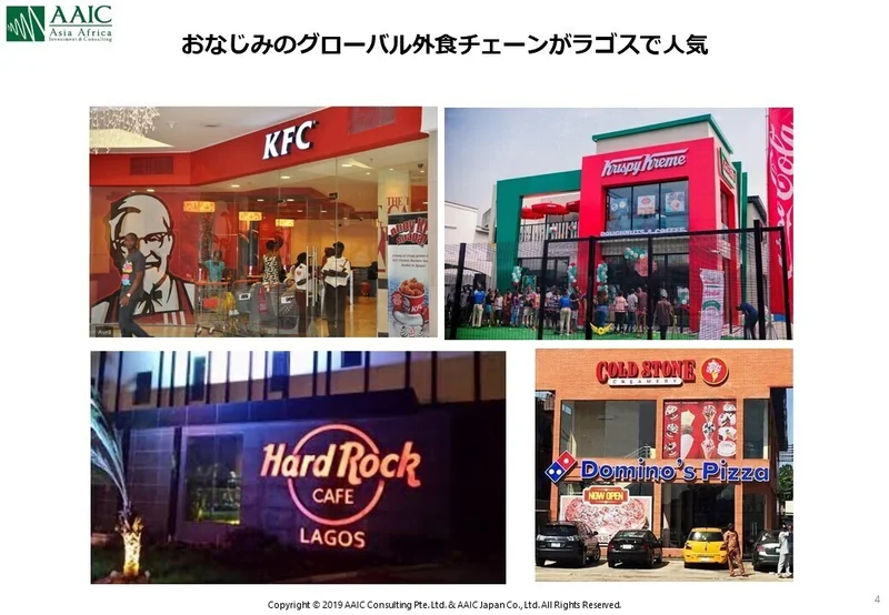 またラゴスのファストフードは、日本でもおなじみのグローバルブランドが数多く存在します。KFC、 クリスピークリームドーナツ、ドミノピザ、コールドストーンなどがモールや市内の中心街の路面店で存在します。イギリスやアメリカなどの海外の大学などで教育を受けた高所得者層の若い世代などがトレンドセッターとなり、低価格で手軽におしゃれに食べられるブランドとして認知されています。ナイジェリアは2025年頃には1人あたりGDPが3,000ドルを超えると予想されています。別記事にもあるとおり、3,000ドルは「外食元年」とも呼ぶことができます。 最近、日本のマクドナルドが1971年の銀座の日本1号店出店から50周年ということで、宮崎美子さんを起用した新しいCMが話題になりましたがまさに日本が3,000ドルを突破したのもその頃になります。
