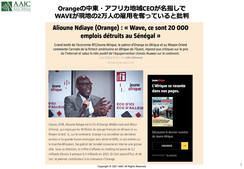WAVEのビジネスモデルは上述した、既存の通信会社が運営するモバイルマネーの事業を駆逐するものです。通信会社より安い、一律1.0%の低価格の送金手数料を押し出し、セネガルで大手通信会社のOrangeが運営するOrange Moneyと激しい競争を繰り広げています。Orangeは現在セネガル国内で50%のシェア、8百万人のユーザーを有する言われています。一方WAVEのモバイルマネーのアプリは5百万ダウンロードを超し、Orangeに迫る成長を見せています。先月、Orangeの中東アフリカ地域のCEOであるAlioune Ndiaye氏が「WAVEは20,000人の雇用を奪っている」と名指しでWAVEを批判したことが話題となりました。それほどOrangeもWAVEを警戒していると言えます。