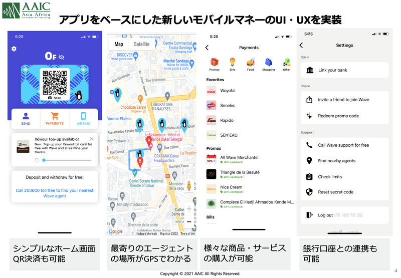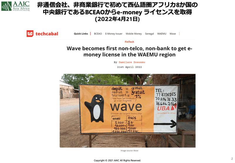 図はAAICに帰属先週、同社は西仏語圏アフリカ8か国の共同の中央銀行であるBCEAOからe-money ライセンスを付与されました。非通信会社、非商業銀行の企業でこのライセンスが付与されたのは初めての事例となります。これまでWAVEはモバイルマネーでの送金は、ライセンスを持った商業銀行に委託していましたが、今後は独自で行えるようになるためさらにコストを抑えることができます。また同ライセンスの取得により、WAVE自身がデビットカードの発行も可能となり、ユーザーはATM等で現金をWAVEの口座から引き出せるようになり、都市部ではエージェントネットワークに頼らずにサービスの運営ができます。