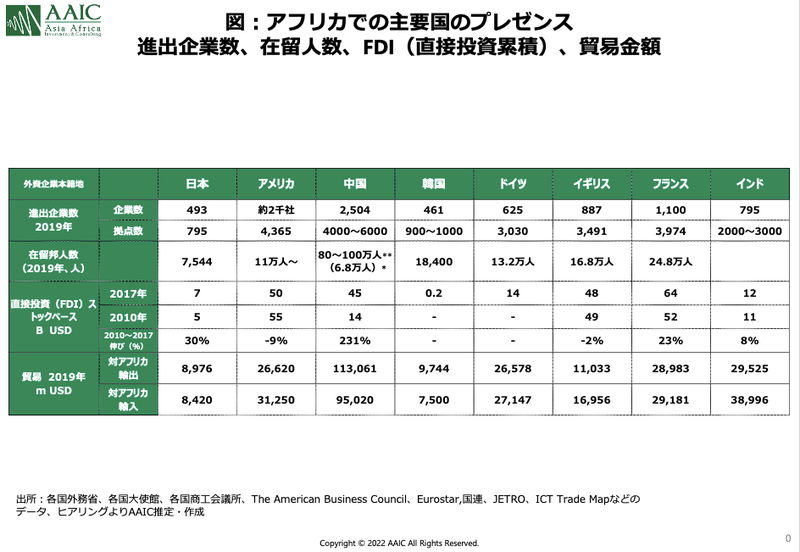 図はAAICに帰属図にあるように、コロナ前の2019年で外務省によるアフリカの在留邦人数は約7,500人。中国80~100万人、フランス25万人、イギリス17万人、ドイツ13万人、韓国1.8万人と他国と比較しても、限りなく劣位である。