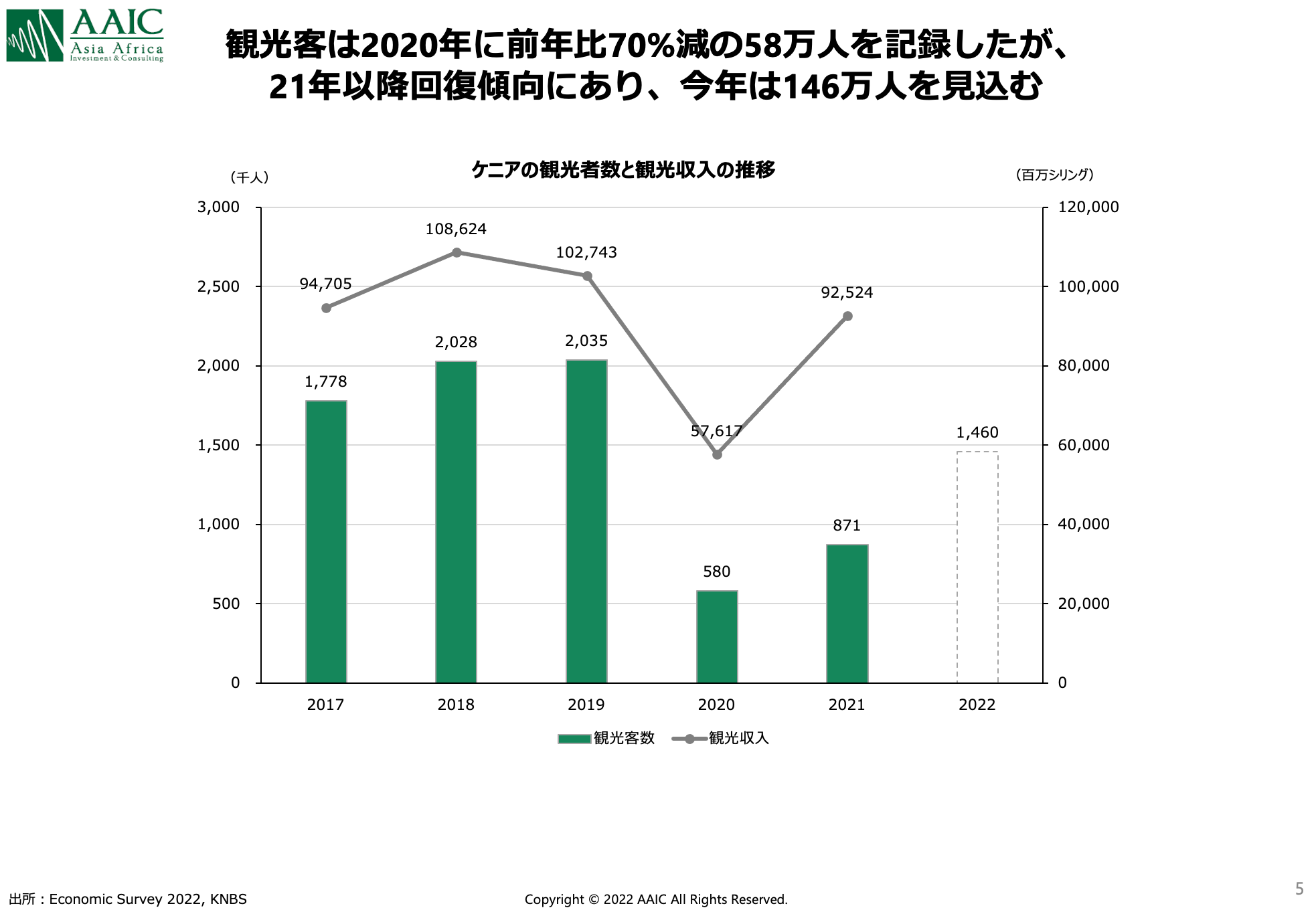 観光については、コロナ前に年間200万人程度で推移していましたが、2020年には58万人と70%減。21年には87万人まで回復し、22年は通期の予想が146万人とコロナ前の7割まで回復しており、明るい兆しが見えています。ケニアはコロナ前、1,000億シリングを超える観光収入を記録していました。昨今の世界的な観光業界の復活を鑑みれば、コロナ以前の水準に戻るまで時間はかからないでしょう。