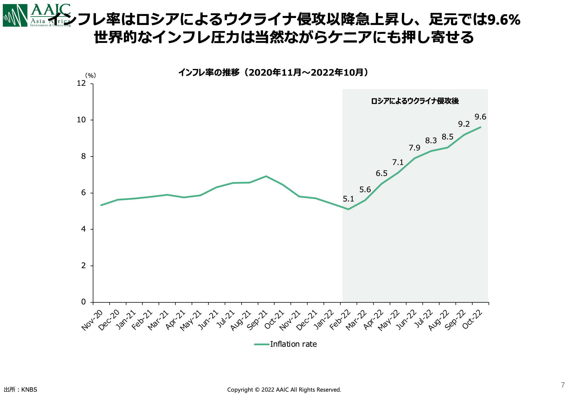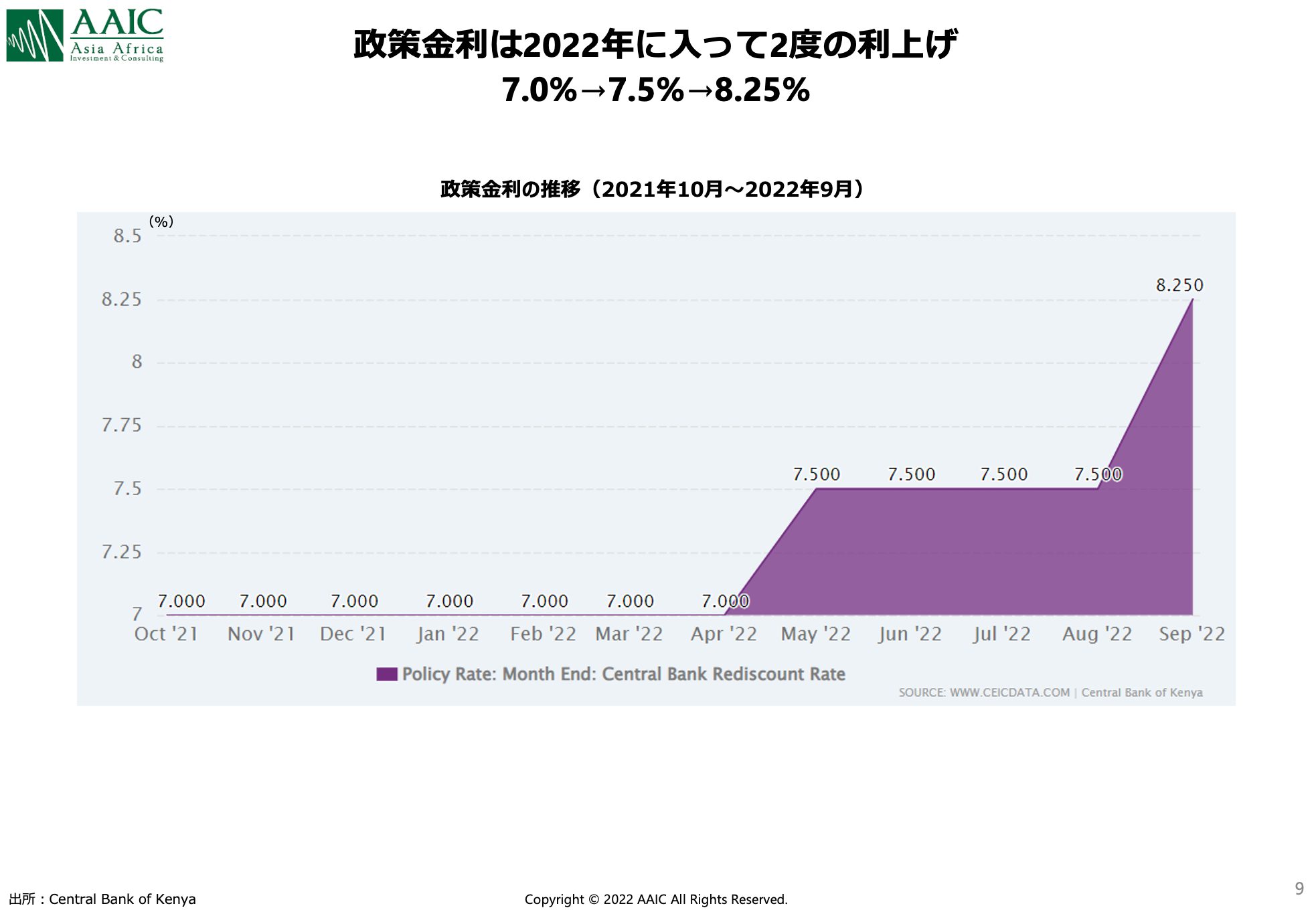 インフレ圧力を受けて、ケニア中銀は22年9月に政策金利を8.25%に引き上げました。同年5月に7%から7.5%に引き上げて以来、今年に入って2度目の利上げです。ケニアのような新興国でもインフレ抑制は喫緊の課題です。