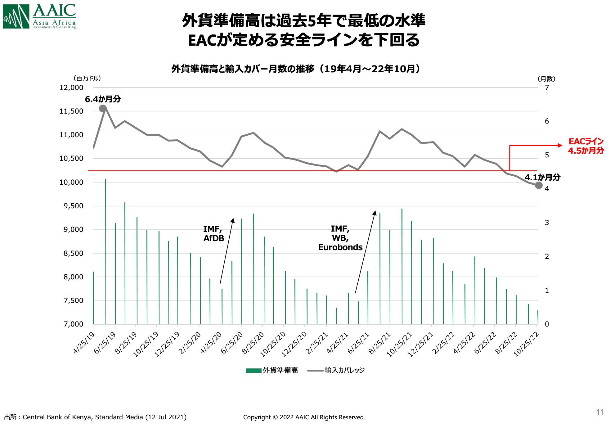 図表12:ケニアの外貨準備高と輸入カバー月数の推移(2019年4月〜2022年10月)