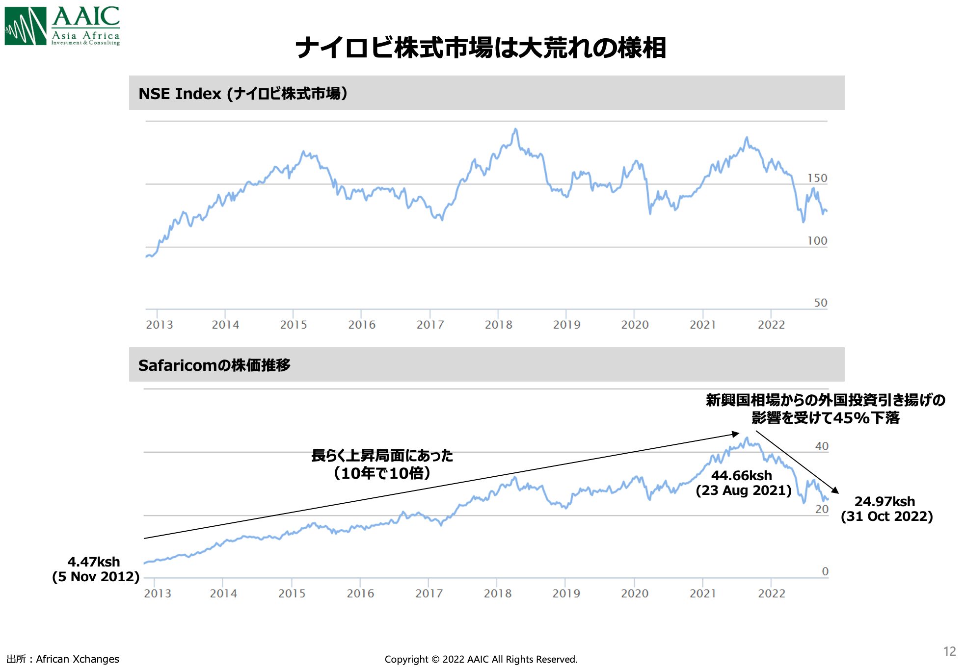 そのSafaricomですが、21年半ばから22年10月にかけて株価は50%下落と目を覆いたくなります。22年10月4日時点での時価総額は9,796億シリングと遂に1兆シリングを割り、年初から5,489億シリングも落としています。FY22の業績は過去最高の2,811億シリングを記録しましたが、先進国の金利引き上げ等に起因する新興国への投資マネー引き揚げが主な要因として挙げられています。