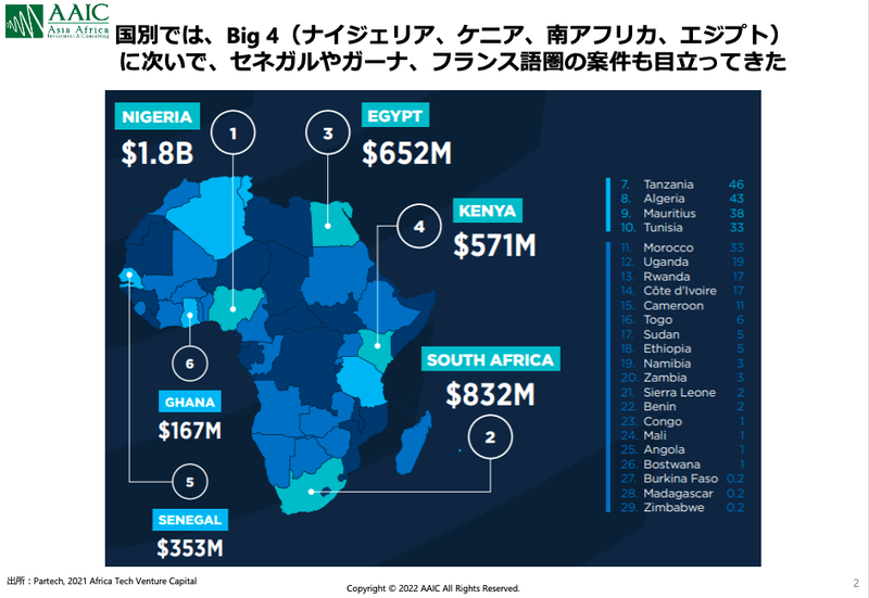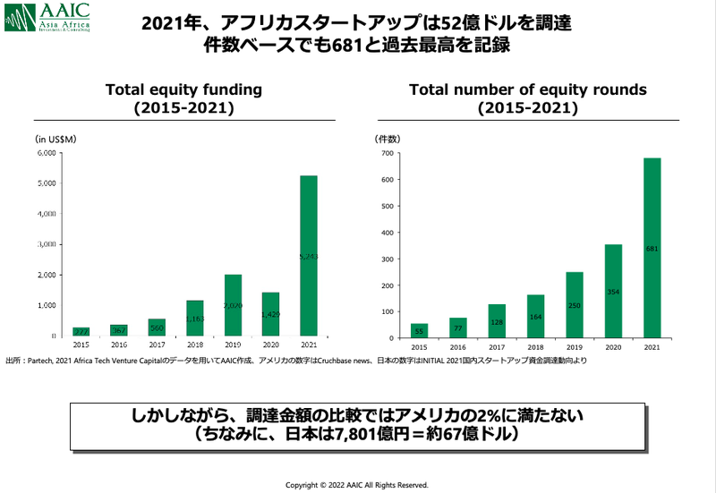 因みに、2021年のアフリカ全体のスタートアップ資金調達52.4億USドルは、同年のアメリカの2%にも及びません。「小さ過ぎるのでは?」という意見もありますが、それだけ伸びしろがあるとも捉えられ、事実アメリカの大手VCもアフリカスタートアップに投資を始めています。例えば、2022年2月にはAAICの投資先であるReliance Health(デジタル保険などを提供)にアメリカVCのAtlantic Venturesが4,000万USドルのラウンドをリードしました。また、ご参考までにですが、2021年の日本のスタートアップ資金調達は7,801億円(68億USドル)と、アフリカ全体とそれ程変わらない状況でした。