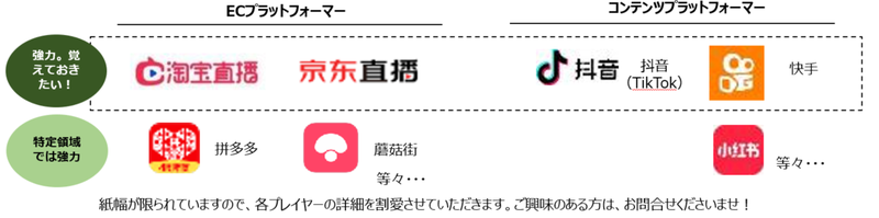 それでは、ライブコマースの主要なプレイヤーの顔ぶれを確認します。中国のライブコマースプレイヤー(最低限押さえたい超有力プレイヤー)には、2つの大きな潮流が存在します。
