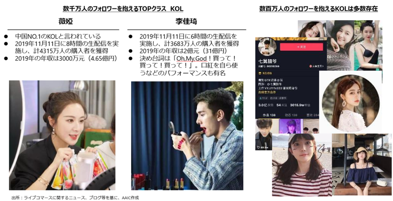 既にお気づきのことと思いますが、ライブコマースは、ユーザーの多い、特定のプラットフォーマーの“場”を使うことは大前提として、ユーザーの支持が多いKOLを捕まえていることが最も大切なポイントです。膨大なフォロワーを抱えるKOLが多数出現しています。