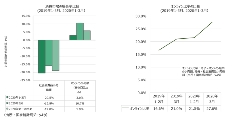 ご存じのとおり、中国では世界に先駆け2020年1月からコロナがアウトブレーク。消費に大打撃を与えました。2020年3月の中国の消費全体の成長率は▲15.8%。巣ごもり消費の食品・医薬品・通信機器類などを除く、殆どの商品が大幅なマイナス成長でした。そのような中、オンライン取引はプラス成長を続けています。2020年3月のオンライン消費の成長率は+10.7%。結果、小売消費に占めるオンライン消費の割合は2020年3月で27.6%。小売消費の四分の一以上が、オンライン上で取引されているのです。(図1参照)まさに、ソーシャルディスタンスが、最も強く反映された結果と言えます図1: 中国の消費市場の成長率比較及びオンライン比率の比較