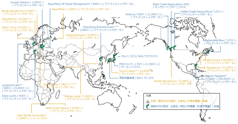 日本の総合商社は、いち早くサーモンの可能性に気づき、市場に参入してきました。三菱商事は2011年にチリのサルモネス・フンボルト、2014年に当時業界第3位のノルウェーのセルマックを買収した他、三井物産は2013年にチリのマルチエキスポートと合弁会社を設立し、養殖事業に参入しました。一方、三井物産は輸入代替の可能性/既存事業のリスクから、2017年に水産物の閉鎖循環式陸上養殖システムを開発したベンチャー企業FRDジャパンを買収、サーモントラウトのRAS建設の検討を開始した他、丸紅は2020年に陸上養殖大手のダニッシュ・サーモンの株式の66.7%をニッスイヨーロッパと取得しました。また、シンガポールに本社を置く投資ファンド8F Asset Managementの日本法人であるソウルオブジャパン株式会社は、三重県津市にアジア最大級となる養殖・加工施設を建設中で、約10,000トン/年の生産を目指しています。 また、世界に目を向けると、同様の輸入代替の可能性に気が付いた養殖業者や投資ファンドが各国で大規模RASサーモン施設の建設に乗り出しています(図6)。今後もサーモンの需要予測は安定して伸長する見込みで、各社の投資がしばらくは続くと見込まれます。一方で、10,000トンを超える大規模施設の稼働を成功させた事例はまだなく、本当に事業計画通りの収益が出るのか、結論が出るまであと数年待つ必要がありそうです。図6 世界の主要なRASサーモン養殖場