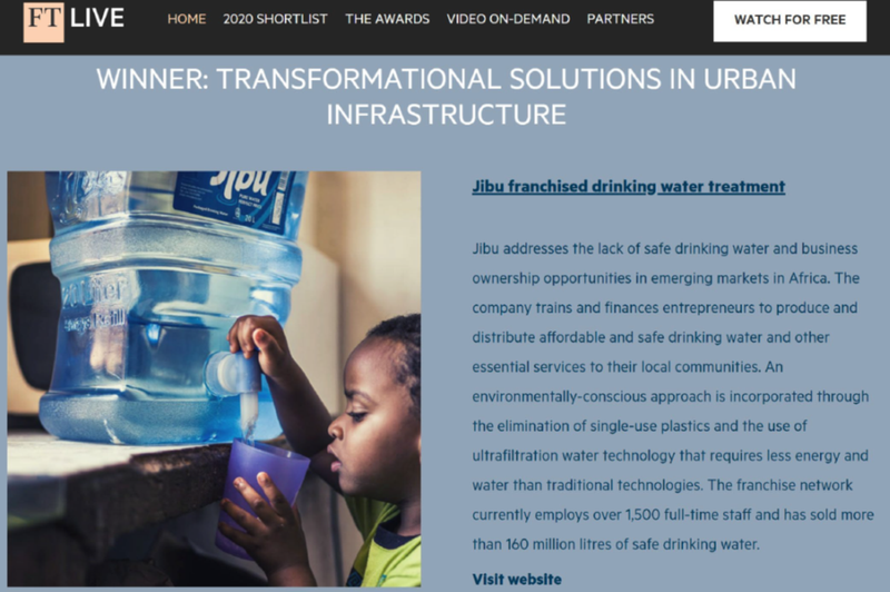 2020年9月、JIBUはFT・IFCのTransformational Solutions In Urban Infrastructureで表彰されました。JIBUの身近に安心・安全な水を提供する分散型インフラモデルとフランチャイズによる起業家育成、雇用創出のモデルが評価されました。