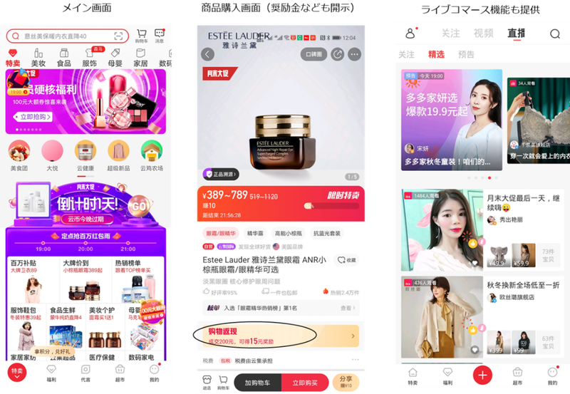 今年、雲集(Yunji)がナスダックに上場しました。雲集はECを展開する中国企業ですが、中国の巨大ECである天猫(Tmall)、京東商城(JD.com)、淘宝網(Taobao)が存在する中、なぜ雲集は創業5年という短期間で上場できたのでしょうか? それは、B2BでもB2CでもC2Cでもない、彼らが展開する新しいビジネスモデルである「S2b2c型EC」が中国のユーザーに大きく受け入れられたからです。 S2b2cとは、Supplier to Business to Consumerの略で、大手サプライヤー(Supplier)が準備した商品を、店主である販売者(Business)が、エンドユーザー(Consumer)に販売するというモデルです。これは、サプライヤー(S)は商品の仕入れ、物流、アフターサービスなどの運営にフォーカスし、販売者(B)は自身が網紅(ワンホン、≒インフルエンサー)やKOL(Key Opinion Leader)として商品を積極的に販売する役目を担い、これをエンドユーザー(C)が購入するという分業モデル型のECのことです。中国では従来より微商と呼ばれるSNSを活用した個人売買が盛んで(WeChatでも同名の機能を提供しています)、これを雲集がうまく仕組み化しました。雲集は、誰でも有料会員になることで販売者(B)になることができ、友人を有料会員へ招待する他、会員数や売上の増加に貢献することで更なる報酬が得られる仕組みを提供するプラットフォーマーとして成功したと言えます(図5)。 この仕組みはネットワークビジネスに近しいモデルであり、実際に雲集は、ねずみ講禁止条例違反で約1.5億円の罰金を科せられたこともあり、グレーゾーンのビジネスモデルと見られたこともありました。しかし、ビジネスの透明性を挙げるとともに、妥当性のあるインセンティブ設計をすることで、無事今年上場することが出来ました。 アリババがS2b2c型ECである“Taoxiaopu”の準備を進めるなどしていますが、S2b2c型ECに関する今後の他社の動向や他国への展開可能性は注目していくべきポイントだと考えています。図5 雲集のモバイルアプリ画面